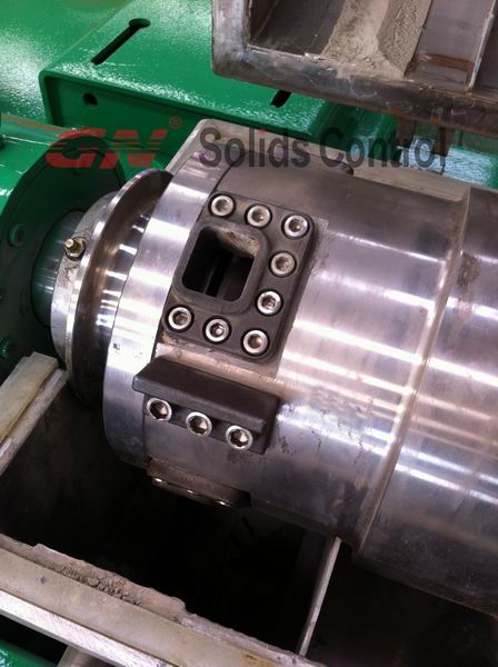 2,一臺電動機帶動轉鼓和螺旋推進器,通過皮帶輪和電動機皮帶驅(qū)動轉鼓,齒輪單元的設計,使螺旋的輸入速度比轉鼓低得多,螺旋的動力同樣來自于同一臺電機,因此差轉速的存在保證了離心機工作可用性。