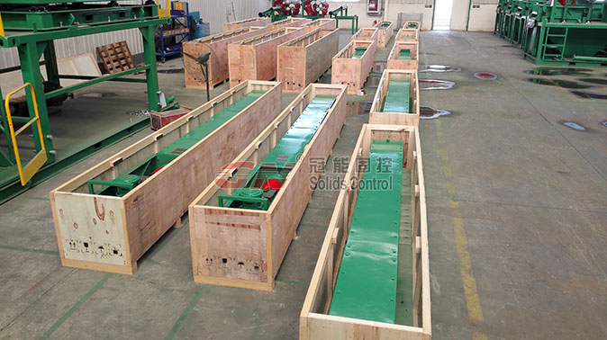 2、配備12臺(tái)螺旋輸送器,用于振動(dòng)篩,泥漿清潔器、離心機(jī)等固控設(shè)備處理后排出的鉆屑,并提供給鉆屑甩干機(jī)。冠能公司生產(chǎn)的螺旋推料器U型槽增加了框架支撐,電機(jī)和齒輪箱也有鋼框架的保護(hù)。螺旋材料采用16Mn,具有更好的耐磨性,螺旋設(shè)計(jì)12英尺為一節(jié),方便現(xiàn)場(chǎng)安裝及運(yùn)輸。
